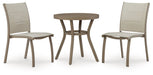 Craft a chic outdoor seating area with this table and chair set. Outfitted in contemporary neutral hues, it's an ideal spot for sipping drinks poolside or relaxing on the porch. Sturdy aluminum construction and sling seating round out the set with both durability and comfort.
