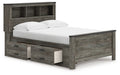 Cool, casual style is for all ages. With this full panel bed with storage, they get the function they need plus the refined design you love. Approachably neutral in a rustic warm gray, it’s adaptable enough to pair with an assortment of existing colors and room decor. Faux metal detailing with nailhead accents lends an industrial edge. Need more storage space? Drawers under the bed help floors stay clutter-free.