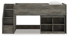 Cool, casual style is for all ages. With this twin loft bed with bookcase storage, they get the function they need plus the refined design you love. Approachably neutral in a rustic warm gray, it’s adaptable enough to pair with an assortment of existing colors and room decor. Faux metal detailing with nailhead accents lends an industrial edge. And with its space-saving lofted design and included bookcase, this bed doubles as a storage solution for toys, books and everything in between.